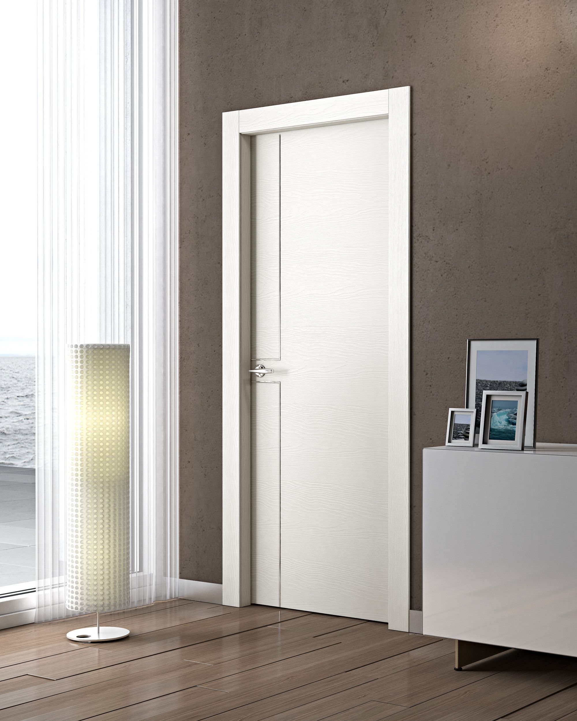 La ligereza de las geometrías. La delicada Incanto R, en lacado blanco, juega en su superficie con el efecto de claroscuros que se crea mediante la alternancia de formas cuadradas de madera cepillada y formas rectangulares lisas, grabadas en la madera. La decoración enriquece el plano central de la puerta sin perder la sencillez del diseño.