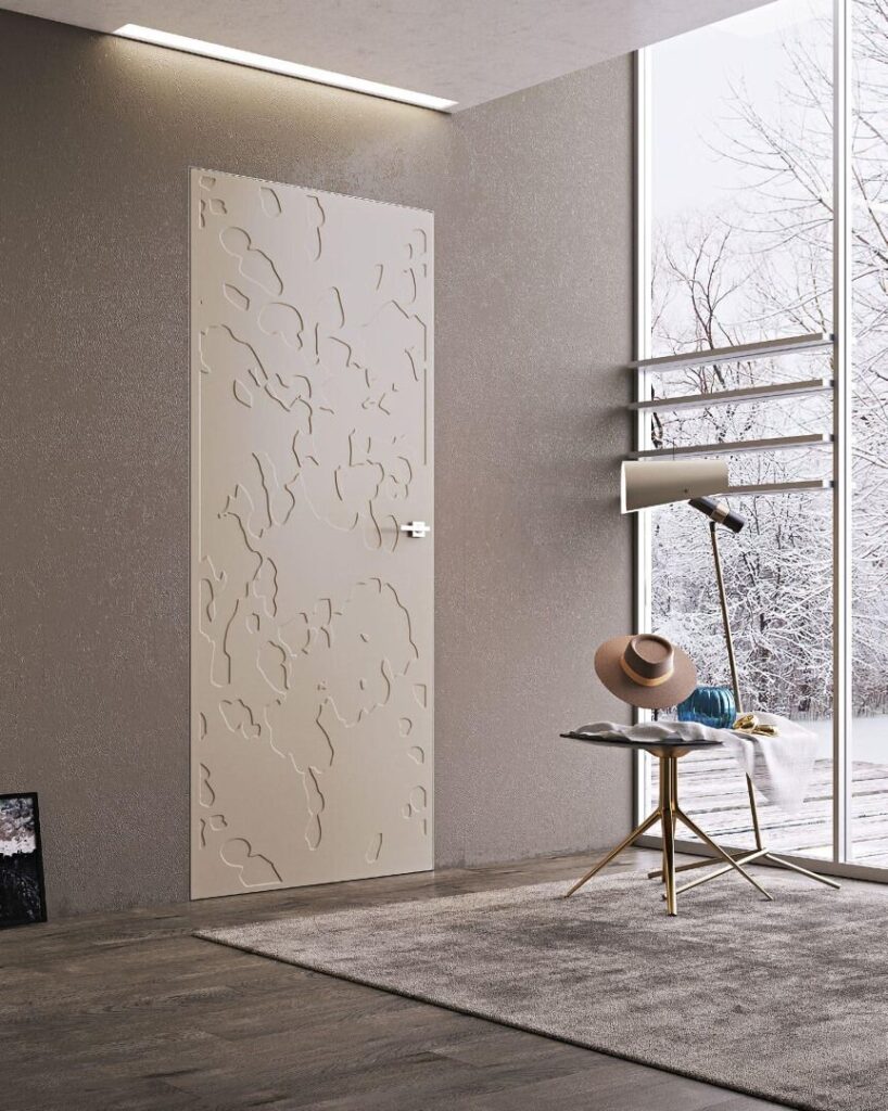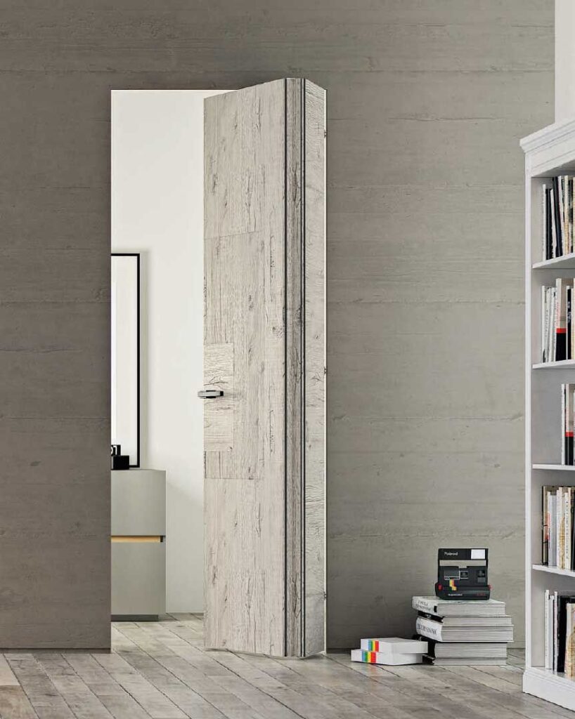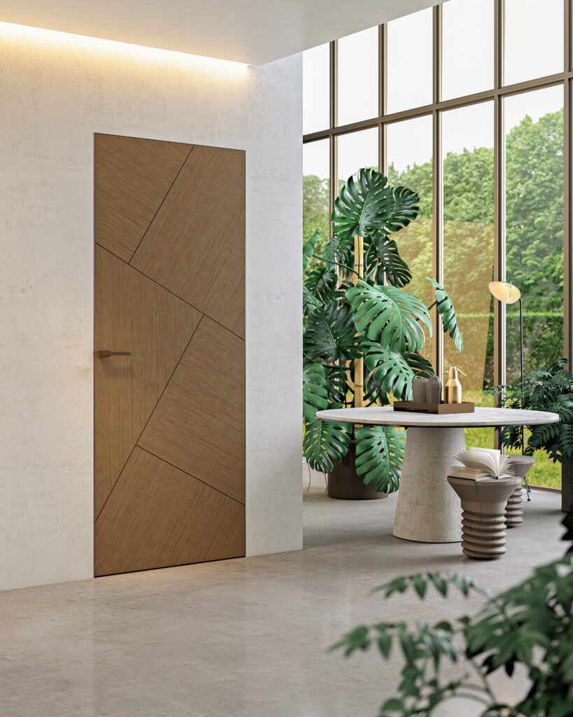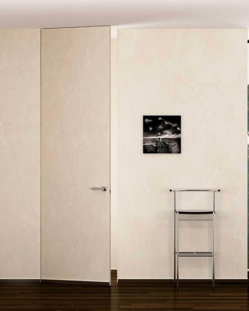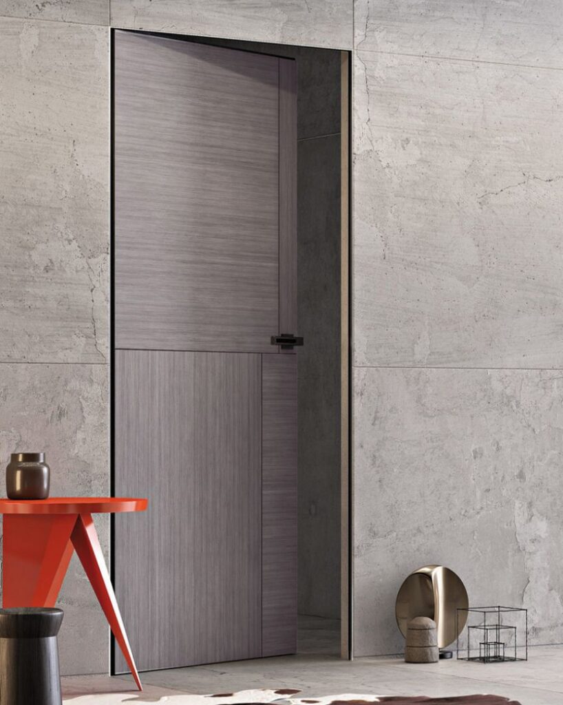 Queste porte sono caratterizzate dalla totale assenza di elementi esterni, come le cornici coprifilo e gli stipiti, in modo da integrarsi perfettamente nella parete creando continuità visiva nello spazio.